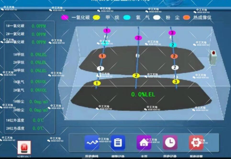 在自燃起火的初期,由于低溫氧化會產(chǎn)生一氧化碳,同時氧氣的濃度也發(fā)生變化,因此需要設(shè)置一氧化碳和氧氣的檢測裝置,進行實時監(jiān)測,以便早期發(fā)現(xiàn),及時采取措施。由于煤發(fā)生氧化或通風(fēng)系統(tǒng)故障會引起氧氣濃度降低,為了確保工作環(huán)境的安全,應(yīng)保證氧氣的濃度在18%VOL以上;空氣中可燃氣體甲烷(CH4)的含量應(yīng)在1.5%以下,利用甲烷比空氣易擴散的特性,在排氣流集中部位的煤場上部安裝甲烷濃度檢測儀,進行實時監(jiān)測。